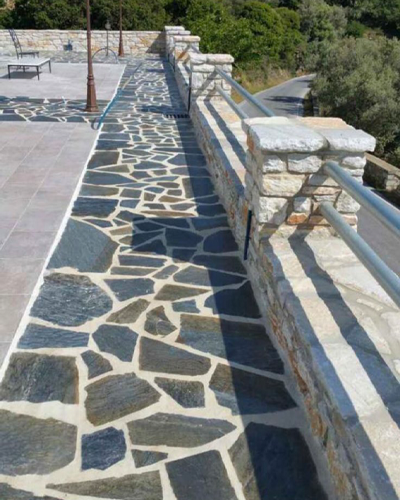 Zahvaljujući visokoj čvrstoći i otpornosti na habanje, Karistos kamen je odličan izbor za podove u frekventnim prostorima, kao i za zidne obloge koje zahtevaju postojan i kvalitetan materijal. Lomljena obrada dodatno naglašava prirodnu estetiku i sirovu lepotu kamena.